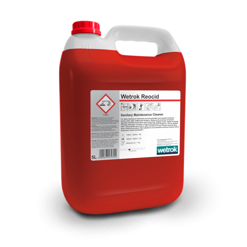 • Reocid has a pH of 4.5 that helps reduce buildup of limescale and urine scale on restroom surfaces.