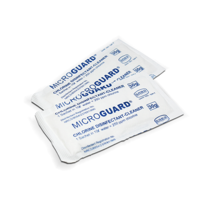 - Microguard is a SABS approved chlorine disinfectant cleaner that comes in a handy sachet for easy dispensing and usage control.